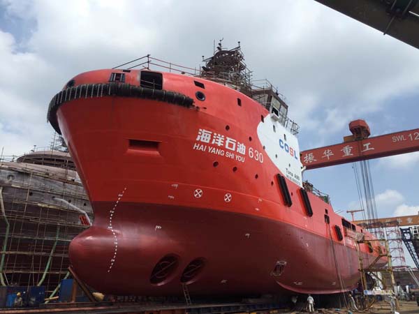 由南通豪通船務(wù)(上海事業(yè)部)在上海振華重工承接總包搭載工程的中海油服三艘6500HP油田守護供應(yīng)船,其中第一艘船“海洋石油630”于8月31日拖移接駁,成功下水。